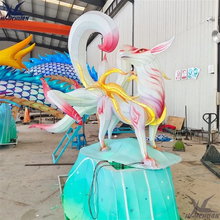 꼬리가 9개 달린 여우 모양의 중국 신화 속의 생물. 두꺼운 철선과 강철 프레임을 용접하여 구미호 모양을 만들고, 색상이 변하는 램프 벨트로 모양을 고정하고, 몸체 표면을 실크 본딩으로 고정하고, 마지막으로 전문 화가가 이 구미호를 더욱 똑똑하고 아름답게 만들어 줍니다.